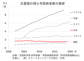 これまで述べてきた博士課程の入学者数、ひいては博士号取得者の減少の要因には少子化、人口減少という全体的な母数の変動も少なからず影響していると考えられますが、根本的に「博士課程に進学する意義を見出せない」ことも挙げられるでしょう。